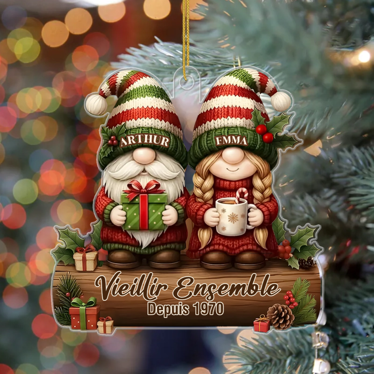 Ornement Acrylique Personnalisé - Lutins Amoureux – Cadeau Couple Noël, Mariage & Anniversaire – Vieillir Ensemble