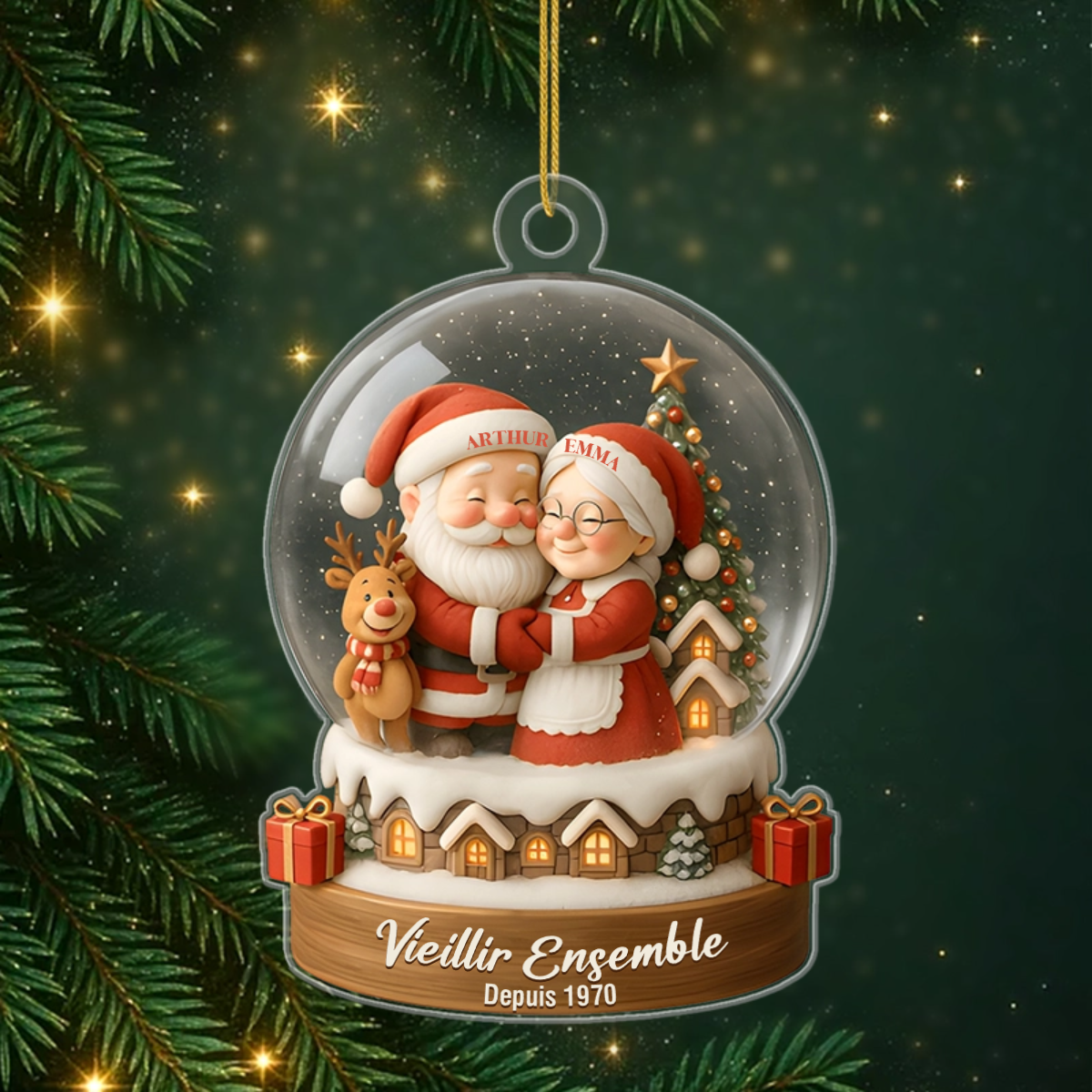 Laissez la magie de Noël immortaliser votre histoire. Cet ornement en acrylique personnalisé, au charmant effet boule à neige, célèbre votre amour avec un Père et une Mère Noël tendrement enlacés. Personnalisez-le avec vos prénoms et votre date de rencontre ou de mariage pour un souvenir unique et intemporel. C'est le cadeau parfait pour montrer que votre amour est aussi durable que l'esprit de Noël.